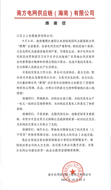 10月16日,上上電纜收到一封來自南方電網供應鏈(海南)有限公司的感謝信。信中表示,“9月6日,海南遭受自建國以來登陸我國風力最強秋臺風‘摩羯’正面襲擊,全省電網受到嚴重影響”“開展抗災復電工作以來,貴公司迅速響應,鼎力支持,配合我司開展應急物資供應行動,與我司共克時艱、全力以赴,為打贏防御臺風‘摩羯’抗災復電這場硬仗大仗提供了堅強的物資供應保障。” 該信傳達了南方電網供應鏈(海南)有限公司對上上電纜衷心的感謝和對上上服務的高度認可。災情牽動人心,上上電纜快速響應,以實際行動踐行企業的擔當和企業社會責任,為災區電力搶修貢獻力量。