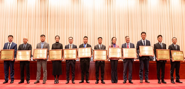 總經(jīng)理丁志鴻(右六)上臺領(lǐng)取2024年度常州市數(shù)字經(jīng)濟(jì)示范企業(yè)