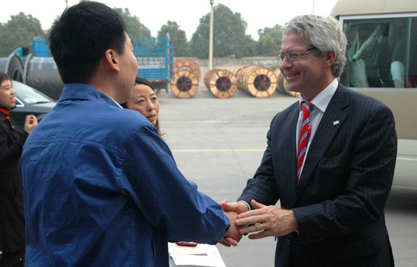 11月1日,荷蘭萊瓦頓市政府代表團一行20余人在溧陽市經濟開發區管委會主任石偉期等的陪同下來江蘇上上電纜集團考察。集團副總經理滕峰等陪同萊瓦頓市市長費德?克龍一行參觀了北廠區生產現場。